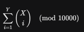 Because the modulo is 10000 (which is not a prime number), using standard modular inverse formulas for combinations is risky. Generating Pascal's Triangle using DP is the safest way to compute combinations while applying the modulo at every addition.