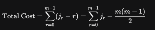 Since (m*(m-1))/2 is a strict constant based on lengths, minimizing the total cost strictly means minimizing the sum of the removed indices (j_r).