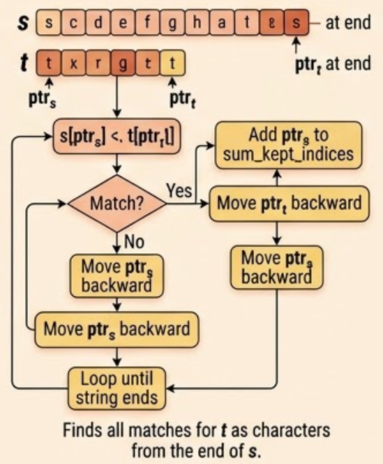 We initialize two pointers at the ends of strings s and t. We iterate backward through s. Whenever s[ptr_s] == t[ptr_t], we record ptr_s as a kept index, add it to our sum_kept_indices, and move ptr_t backward.