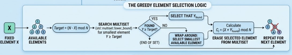 To efficiently "pick the best available element", we can store the elements of the permuted array inside a balanced Binary Search Tree (like a std::multiset). For any fixed element X, the optimal element Y to pair it with such that (X + Y) \bmod N is minimized would be Y = (N - X) \bmod N. We can use lower_bound on the multiset to find the closest available element \ge Y. If no such element exists, we wrap around and pick the absolute smallest available element.
